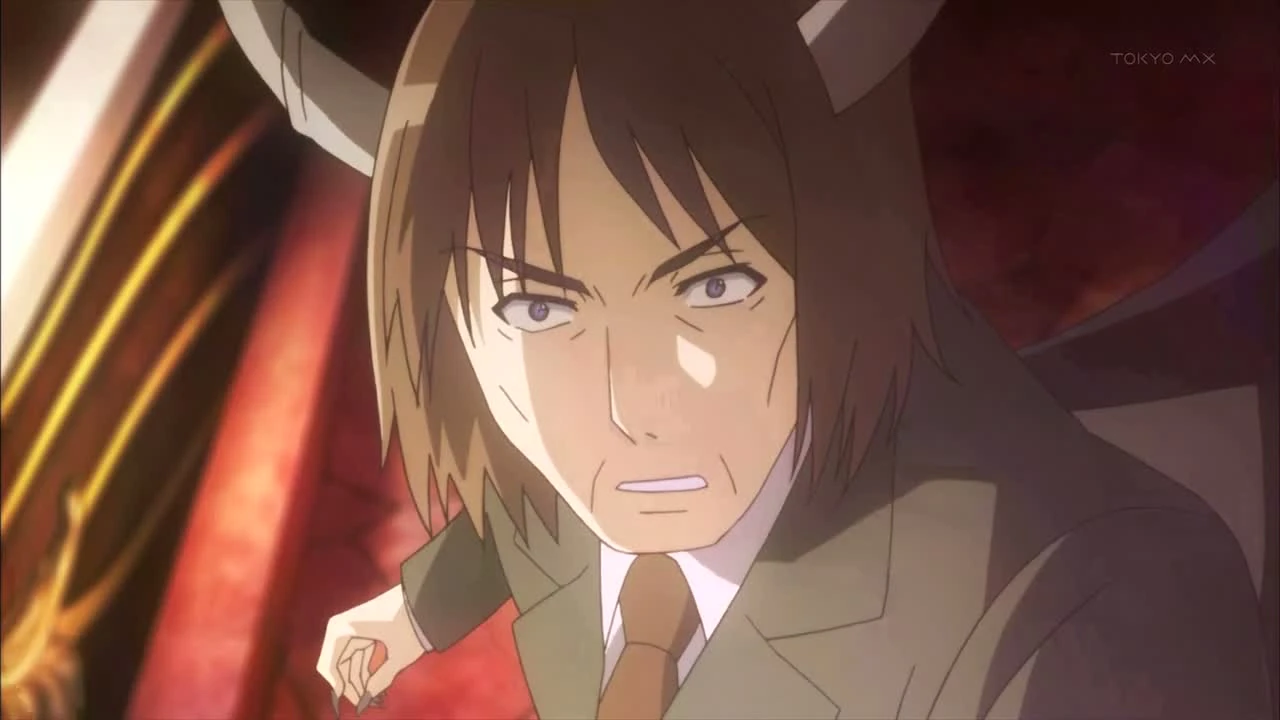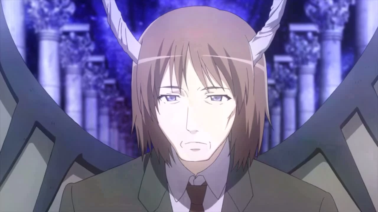 Fecor had the appearance of a feeble, middle-aged businessman, of middle height and build. He had a pale complexion and long, black fingernails. He had straight, brown hair that falls down to his neck, blue-purple eyes, and a few wrinkles on his face. He wore a dark-green suit with a red-orange tie under a white shirt. Fecor also had horns, a pair of bat's wings, and a long tail. His horns were white and protruded upwards. His wings were black in color and his wingspan was relative to his height, with horns coming out of the top. His tail was black and thin, having an arrow-shaped tip and reaching his feet. Fecor had a belt that was wrapped diagonally around his waist, which housed the short sword Oreikhalkos on his backside. In the anime, he was 168 cm tall.[1]