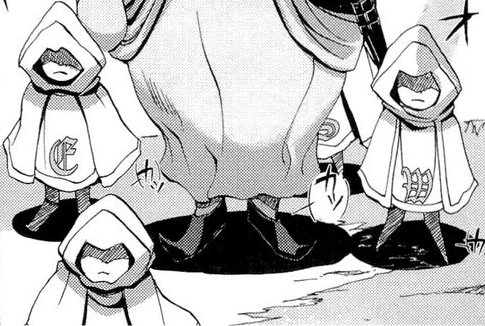 The Four-way Ghosts took the forms of 4 dolls of children that followed Gaap around. They stood around him in a circle, with one doll in each of the four cardinal directions. Like Gaap himself, the dolls wore hoods and cloaks. Each doll had a Gothic letter on the bottom of its tunic to represent the direction it was standing in respect to Gaap, with the north doll having an "n", the south one having an "s", and so on.[2]