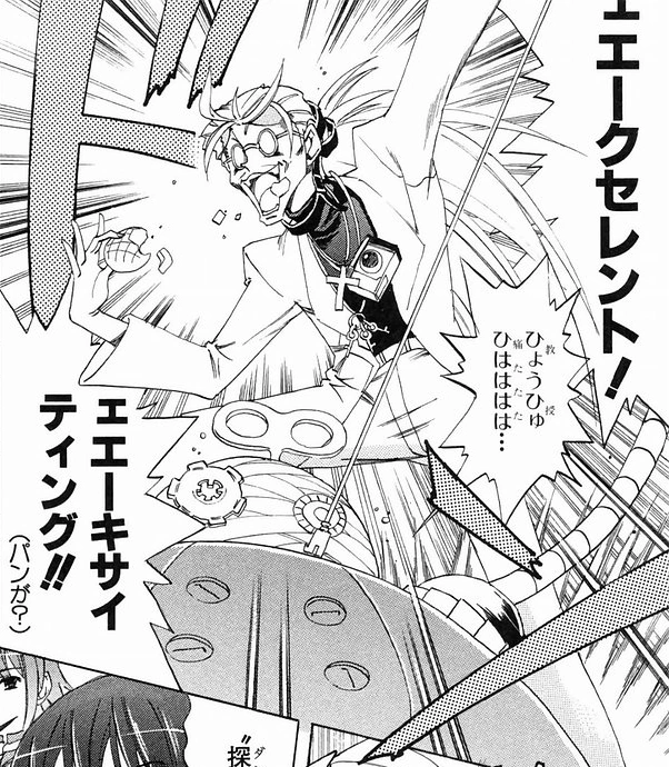 Yūji's incantation during his transformation sequence, Dōmaki Essaimu Arabinkarabin Chinkarahoi (ドーマキ エッサイム アラビンカラビン チンカラホイ), is derived from numerous anime series which feature magic or transformations; "Dōmaki" from Madö King Granzört, "Essaimu" from Akuma-kun, "Arabinkarabin" from Yobarete Tobedete! Akubi-chan, and "Chinkarahoi" from Doraemon. Doraemon was referenced heavily in Shakugan no Shanaemon, another manga in GRIMOIRE. The narration during Yūji's transformation sequence is a parody of the narration explaining the biological process behind the transformation of the hero, The Blader, in the TV show Choukou Senshi Changéríon, which Shakugan no Shana author Yashichirō Takahashi often references. This narration was previously paid homage to in chapter two of the second light novel volume and the 24th manga chapter.