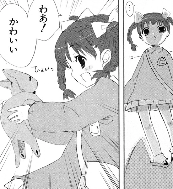 While walking with her mother, Mika found an exhausted Nina in an alleyway. Unaware that it was a Rinne, she took the plush toy with her. When Mika and her mother walk past Yūji Sakai, Nina reacted to him and slipped out of Mika's arms before transforming. Mika began crying and was shielded by her mother.[1] Mika and her mother were presumably unharmed after Shana destroyed Nina.