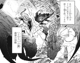 Töten Glocke was again opposed by the Flame Haze, who had now gathered into an army. Though Merihim's Aeria were annihilated by Mathilde Saint-Omer, Illuyanka was heavily injured by Wilhelmina Carmel, and another of the Nine Eternal Divine Scales, Ninurta, had fallen in battle, Töten Glocke was again victorious and retreated with Nachtigall. Ninurta had stayed behind and fought Mathilde to allow Töten Glocke to retreat.[5] Besides Töten Glocke succeeding in their objective, the Flame Haze Army's large casualties meant that they had lost the battle.[3]