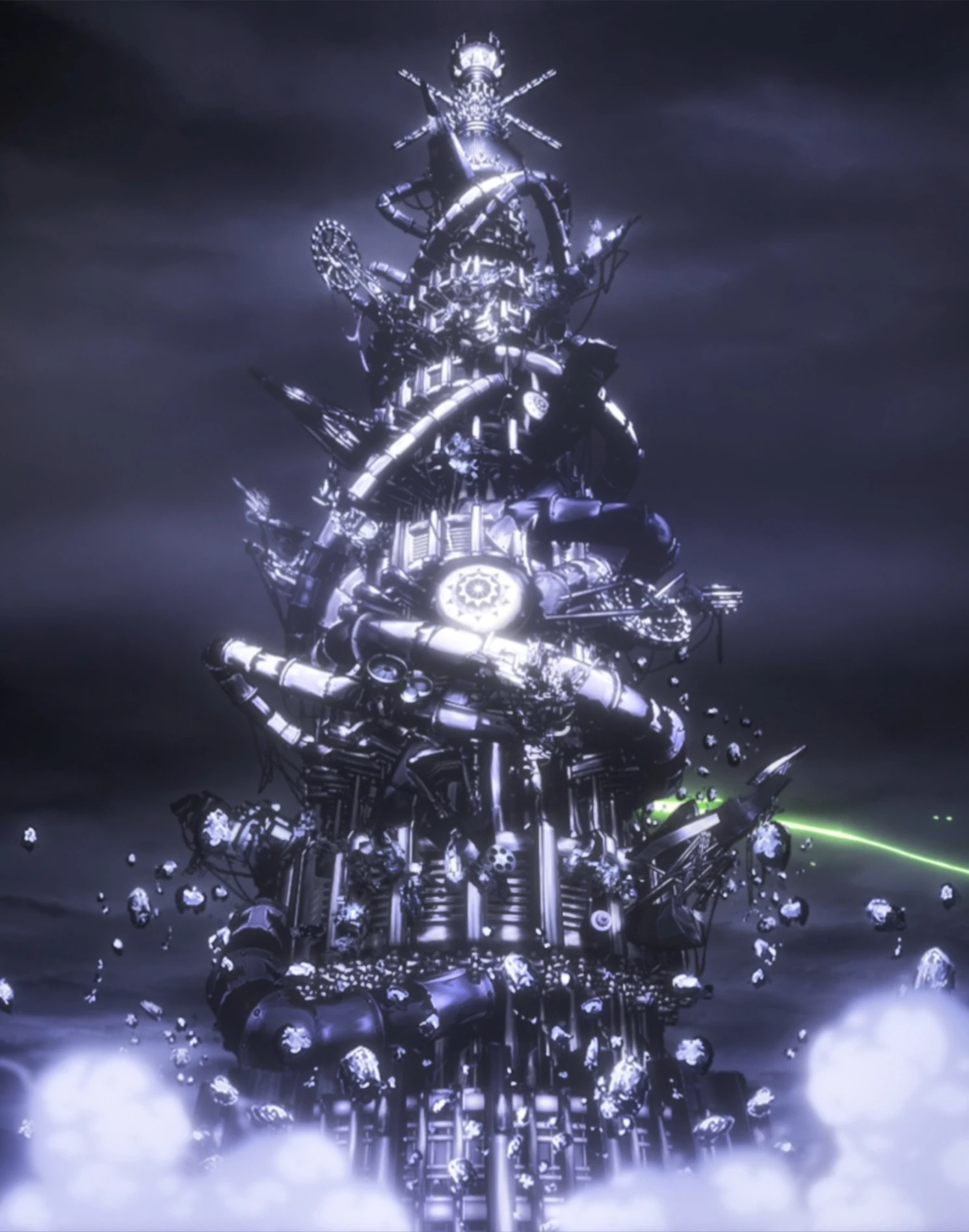 However, its downfall was rooted in the very fact that it had settled on the ground. The base of Saishuku no Shadan was carved out by Khamsin’s Rubble Giant as material, literally pulling the ground from beneath it. This put Saishuku no Shadan on the brink of collapse, but Sydonay threw the massively enlarged and extended Shintetsu Nyoi as a temporary core pillar, making it barely managed to hold together. Immediately afterward, Dantalion and Domino relocated to the device control room to readjust the machinery and reconfigure Saishuku no Shadan. However, the control room they were in was pushed outside in the process, exposing them, and ultimately led to their demise by Kisan no Taiken.