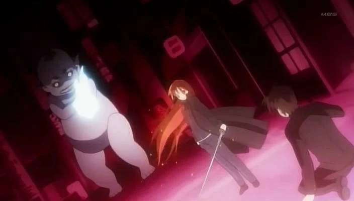 The two creatures discover that Yuji can move about in the Fuzetsu, and deducts that he might be a Mystes. Curious about his identity, one of the creatures grabbed Yuji and attempted to devour him... until a blade slices its arms cleanly off. As the gigantic baby doll cries in pain, Yuji finds a girl with blazing-red eyes and hair standing in front of him. Soon, she confronts the creatures in front of her and mercilessly defeats the two. The girl with blazing-red eyes soon ask about Yuji's existence, and like the creatures she defeated, a voice she refers to as "Alastor" assumes that he is a Mystes. Then, she attacks another creature; this time, it is in the form of a woman, and that creature mockingly identifies the girl with blazing-red hair and eyes as the "Flame-haired Burning-eyed Flame Haze of Alastor, 'Flame of Heavens'". As the Flame Haze is about to deliver the final blow, a confused Yuji goes in the way, and is instead attacked by the enemy. Leaving with no choice, the Flame Haze strikes her sword and tears a large gash off Yuji's shoulder, slicing off the enemy's arm in the process. Shocked by the attack he receives, Yuji falls to the ground as a small doll-like figure escapes from the scene.