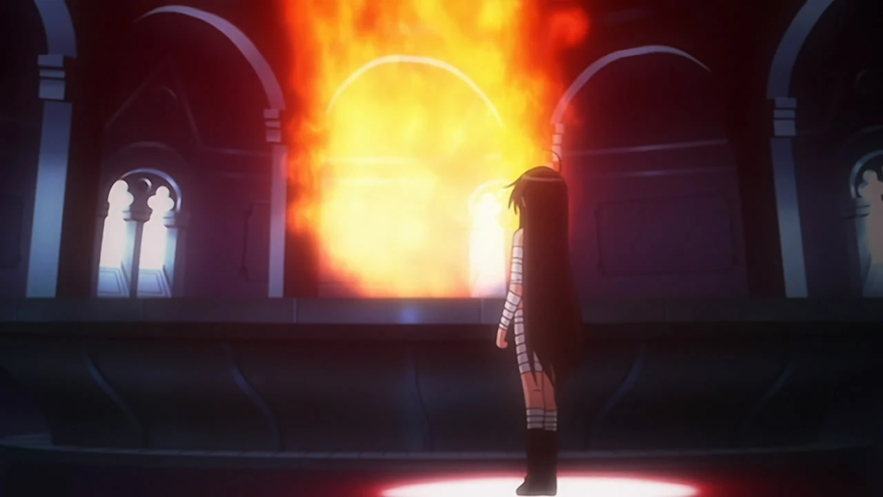 Merihim emits his power and make Tendōkyū discoverable for all to see. Vine, rising a motorcycle saw Tendōkyū rejoiced and immediately finds his way to Tendōkyū. Tenmoku Ikko also saw it and wanted to challenge the new "Flame-Haired Burning-Eyed Hunter" (炎髪灼眼の討ち手 Enpatsu Shakugan no Uchite), Shana (who has not been given a name at that time). Wilhelmina Carmel and Tiamat was surrounded by Orgon to be forced by him to tell the location of Tendōkyū. After they felt that something bad is going to happen to Tendōkyū and possibly Shana, they immediately attempts to escape from Orgon's hands and head towards Tendōkyū. Orgon immediately chase her as he wanted to know Tendōkyū's location to stop the birth of the new "Flame-Haired Burning-Eyed Hunter" but Tenmoku Ikko come into the presence of Orgon and his army and slashed the frightened Orgon.
