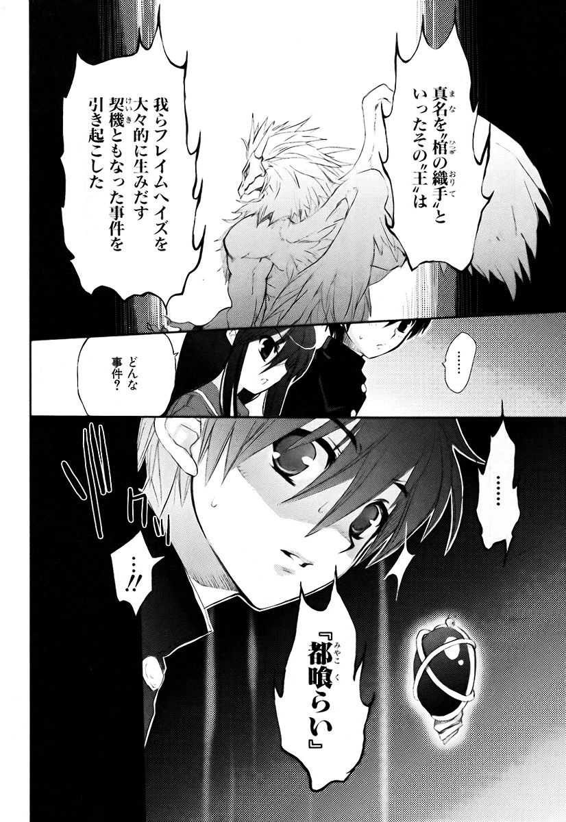 It was getting dark and Yūji and Shana were walking through the city after having left the bridge. Shana took out her twin-tails and said that they should still be careful. Yūji noticed something about the Torches across the road. He figured that he could now tell, like Shana could, how old they were by the strange pulsation they had, but Shana didn't know anything about the pulsing. Yūji explained that the flames of old Torches were swaying slowly and the flames of new ones were swaying faster, but both Shana and Alastor couldn't see it. Shana suspected that this ability of Yūji's was due to the Treasure Tool inside of him. Alastor asked if all the Torches were pulsing, which Yūji confirmed. Shana thought it might be to do with the large number of Torches in the city. Alastor told them of a Lord who created a big Distortion in the West a long time ago by putting a mechanism in the Torches that he had devoured. The incident that the Lord, the "Weaver of Coffins", had caused led to the creation of many Flame Haze to oppose him. The incident was known as the "City Devourer", with the name shocking Yūji.