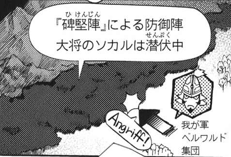 Karl shouted to his army to gather around him so that they can pierce through the forest, causing Sokar to begin attacking with the forest trees. Karl shot an arrow into the sky which exploded into a bright light, after which his adjutant ordered the troops to jump into the air. However, a swarm of flies, Jarri's Sabaeru Kaze, engulfed the troops and killed them, with Jarri watching the battle from afar. The troops who were able to escape the swarm were caught in Sokar's hand-like tree and crushed.