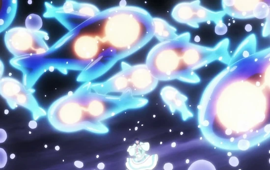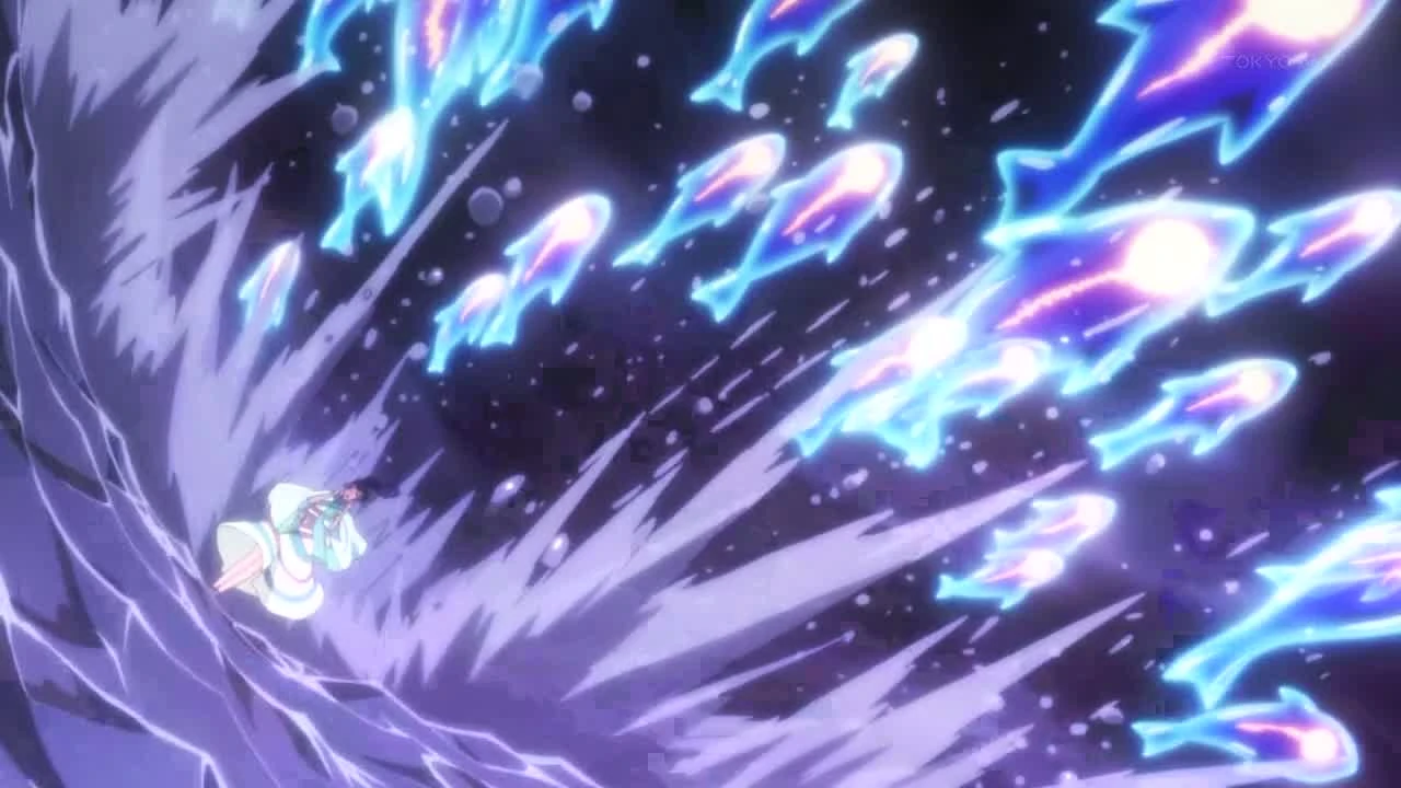 Dance of Sedna (セドナの舞 Sedona no Mai): Westshore's power is to control water and summon sea creatures made from water at will. The creatures resemble dolphins and are comprised of water. They are able to protect Westshore from attacks and trap enemies inside them before decomposing them and converting their remaining Power of Existence into the stable state of water.[2] Westshore is also capable of standing on water and can twirl around to strengthen its currents.[3] She usually summons a group of creatures, but can also summon one enormous one. After trapping enemies, she can then use her flame to destroy them.[4] In addition, Westshore is not limited to summoning aquatic life and can also create birds.[5] This water ability is the opposite of Endan.